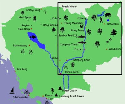 | Travel Info | Travel Info Northeast Northwest South Coast Phnom Penh Siem Reap Sihanoukville Ratanakiri Rivers and Lakes Islands Temples National Parks and Mountains Dive Sites |