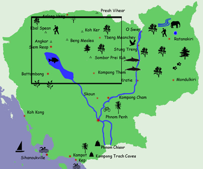| Travel Info | Travel Info Northeast Northwest South Coast Phnom Penh Siem Reap Sihanoukville Ratanakiri Rivers and Lakes Islands Temples National Parks and Mountains Dive Sites |